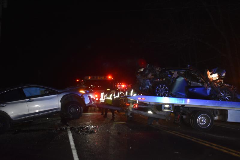 Camden Exxon hauled away both of the private vehicles, with one on the flatbed and the other towed behind.