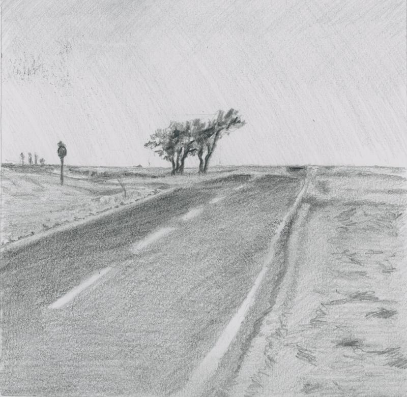 Finally I realized it was a grove of cottonwoods next to the road. Trees were rare enough, but trees playing at being a horse, was special. No pruning or topiary involved — just the wind and the age and arrangement of the trees. I found my final drawing for Oklahoma.