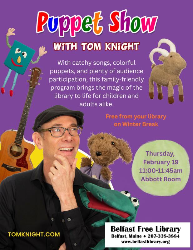 Puppeteer Tom Knight brings the magic of the library to life in a family friendly puppet show with catchy songs, colorful puppets and audience participation, according to Belfast Free Library, in a news release.
