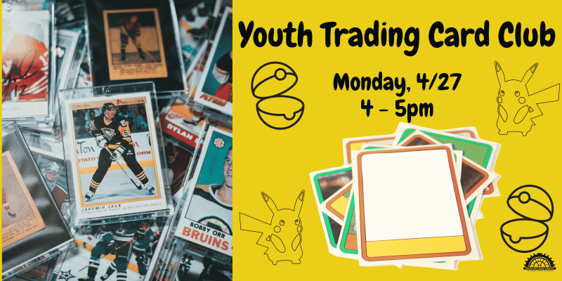 Monday, April 27, 2026 - 04:00 pmThe Youth Trading Card Club meets on the fourth Monday of each month, at 4 p.m., in the Children’s Room.