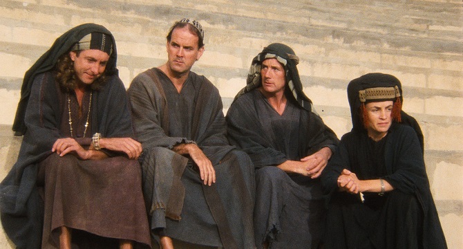 The film soon dives into the political climate of the time, especially the Peoples Front of Judea, led by Reg (Cleese) and including Stan (Eric Idle), who wants to be a woman known as Loretta. In order to join the group, Brian is assigned to write “Romans go home” on the temple walls. Caught by two Roman guards, they force Brian to correct the grammar in his graffiti and then write the slogan correctly 100 times.